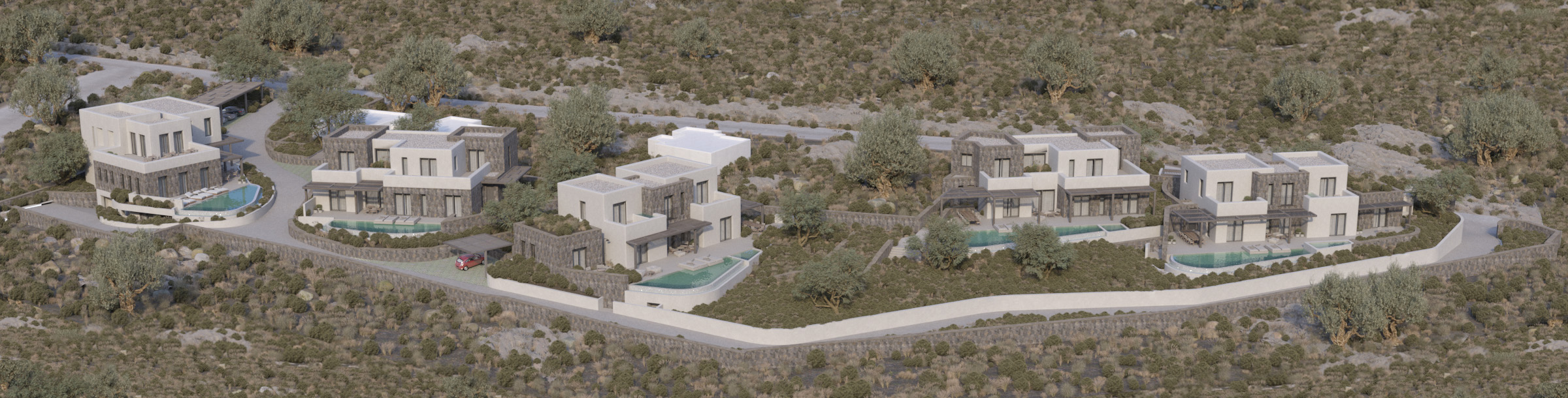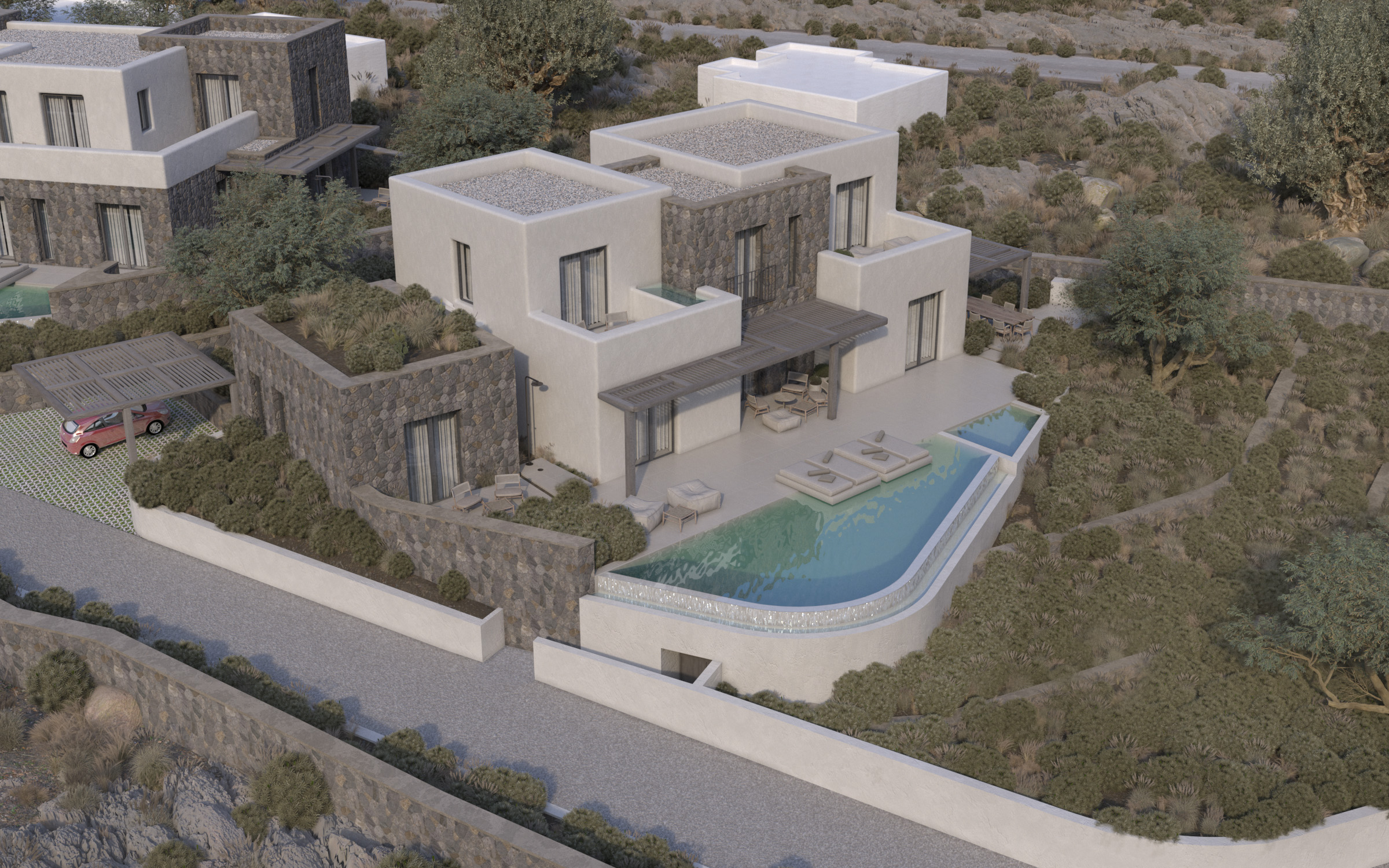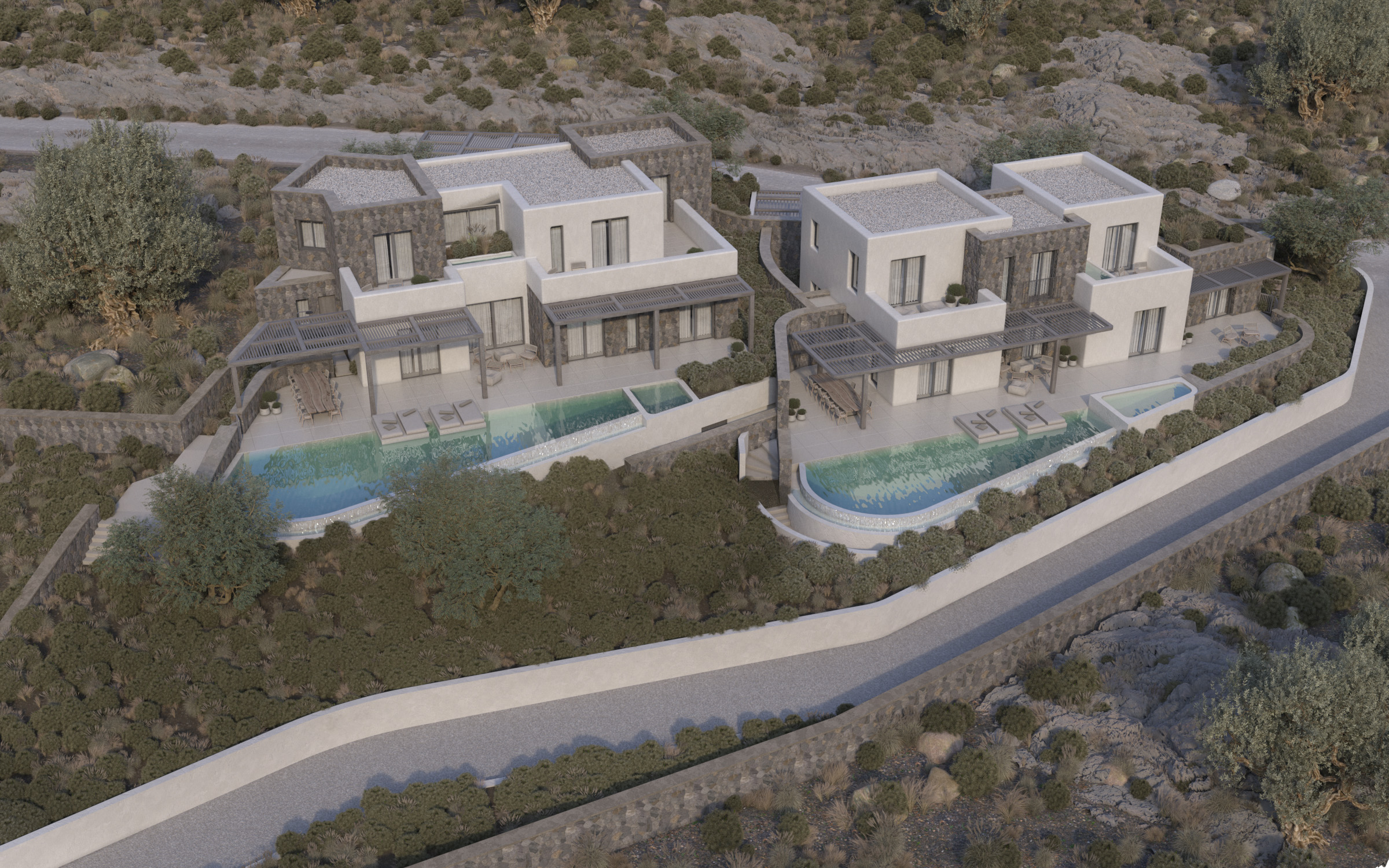 Along with each building, its associated outdoor space is also designed with the aim of achieving a functional extension of the interior. Due to the touristic use for these three plots, swimming pools are proposed for all buildings. All buildings are designed in such a way as to enjoy views toward the sea, with southeast orientation.