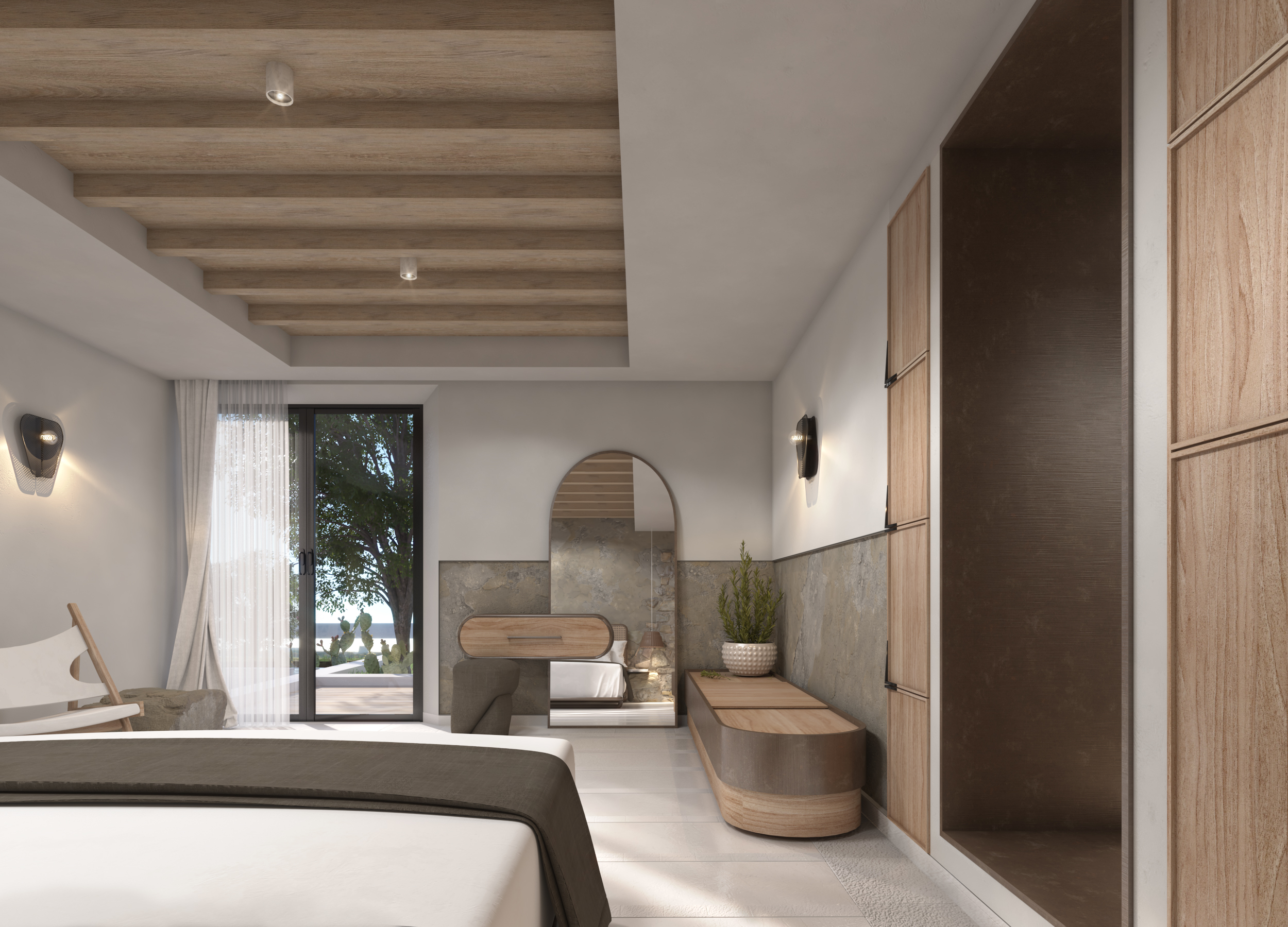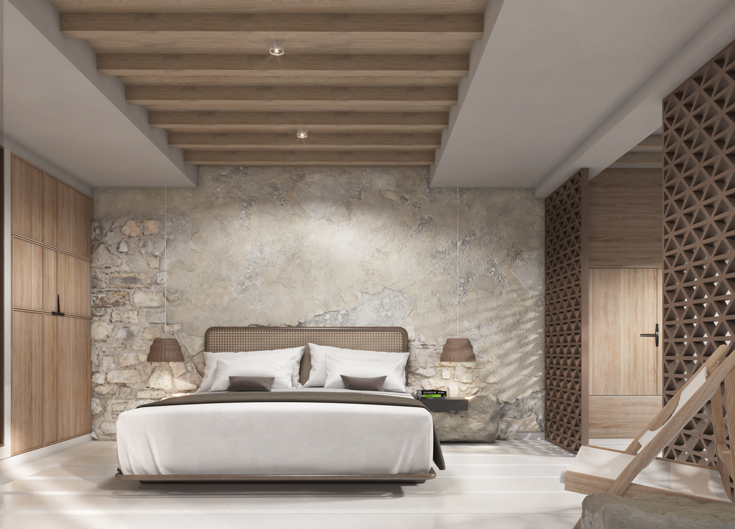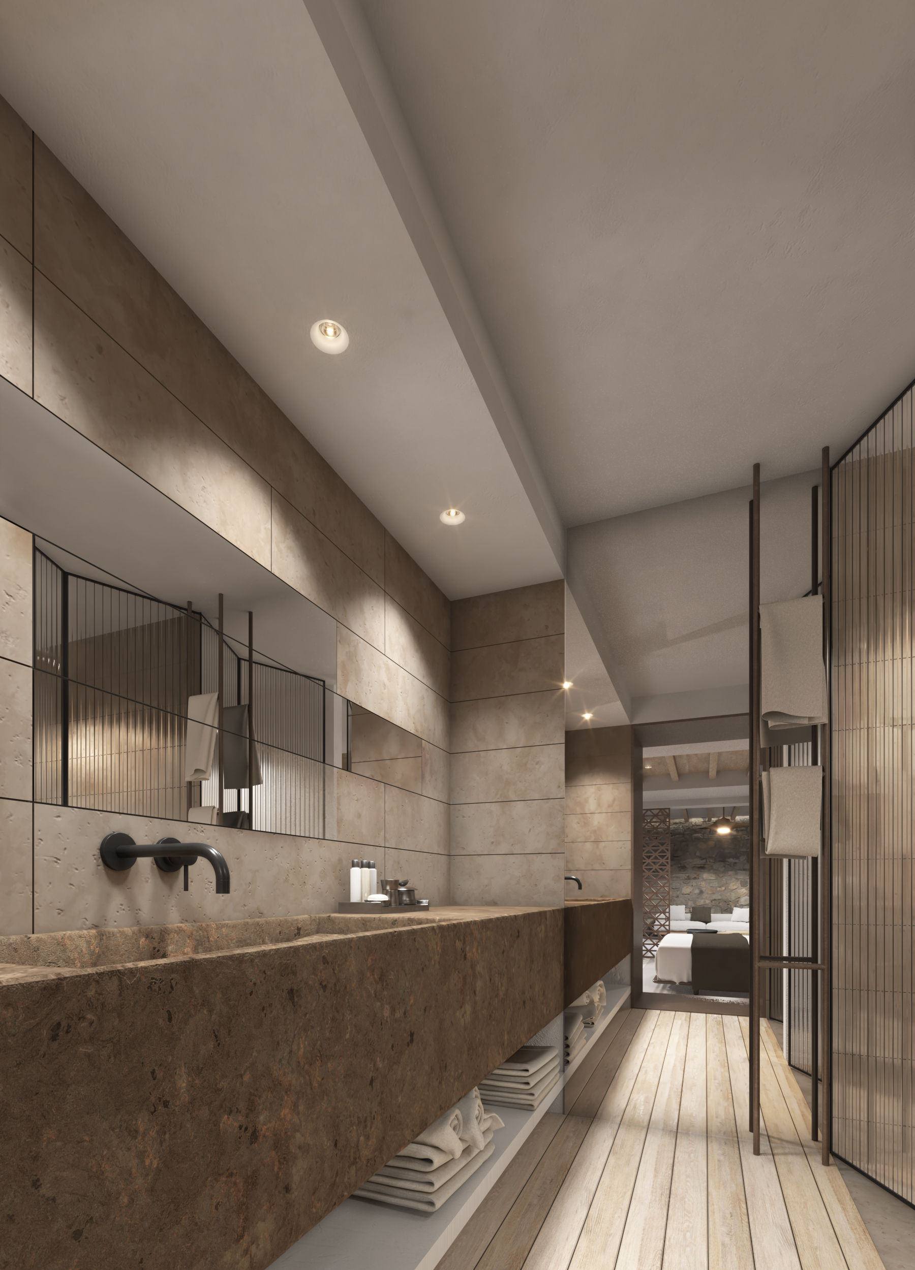 In this secluded and remote part of Peloponnese is a small traditional village with few houses; it is one of the very famous and historic locations. The vibrant blue waters in the bay are dominated by the very high mountains of its west side. On this rocky side this new hotel is designed, it fits in the natural inclined site and has communal areas and suite-style rooms, borrowing architectural elements from the local architecture. Most of the buildings are clad in stone. The hotel overlooks the whole bay, and there is a magnificent view from every room of the sea and the village.