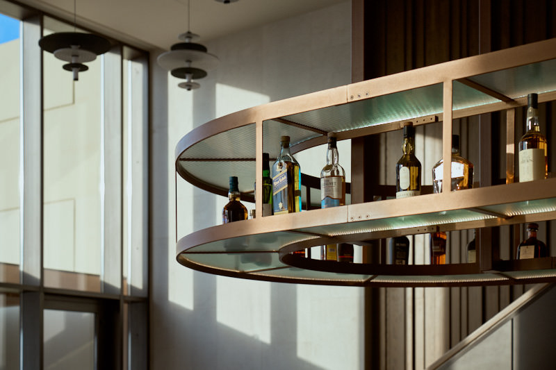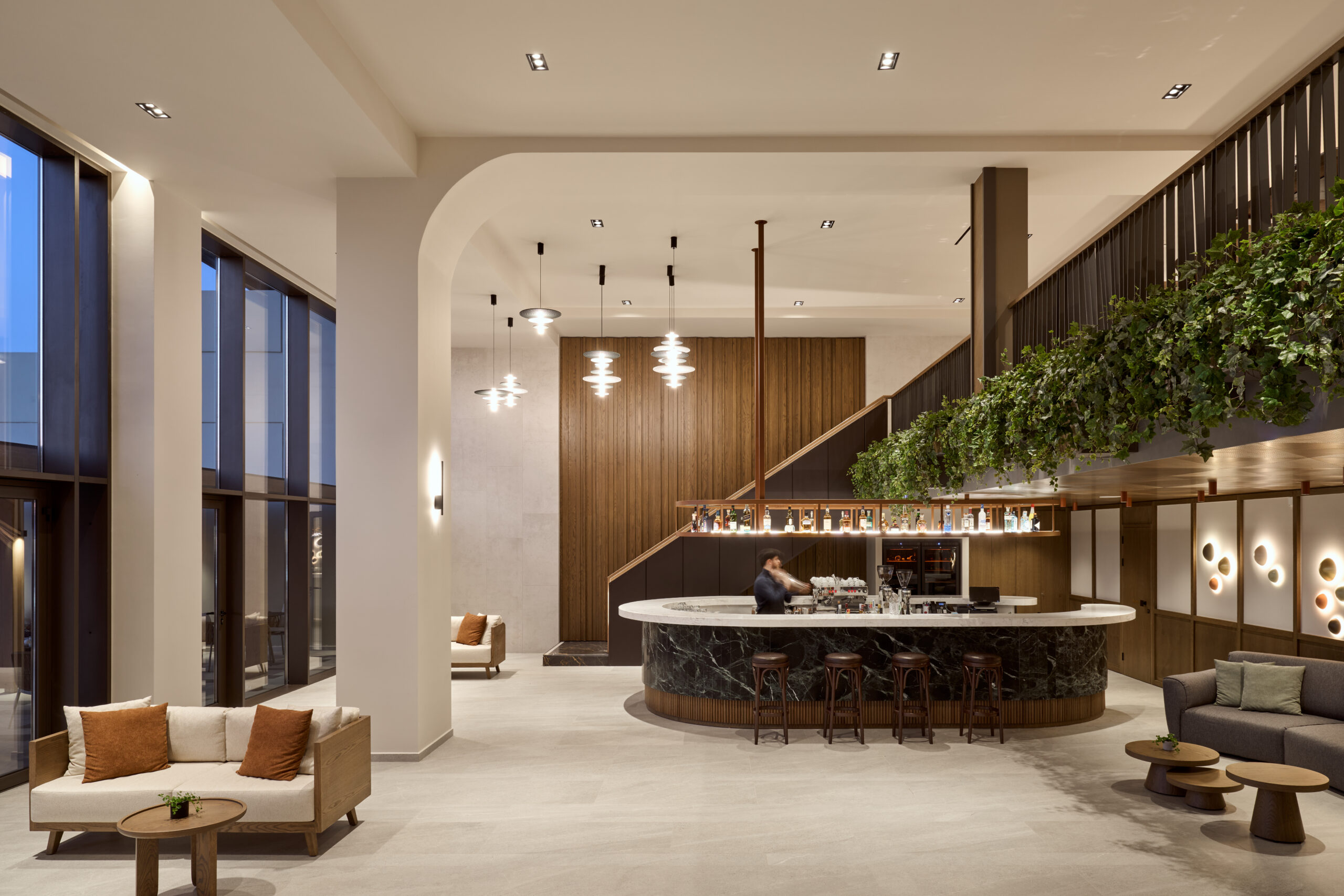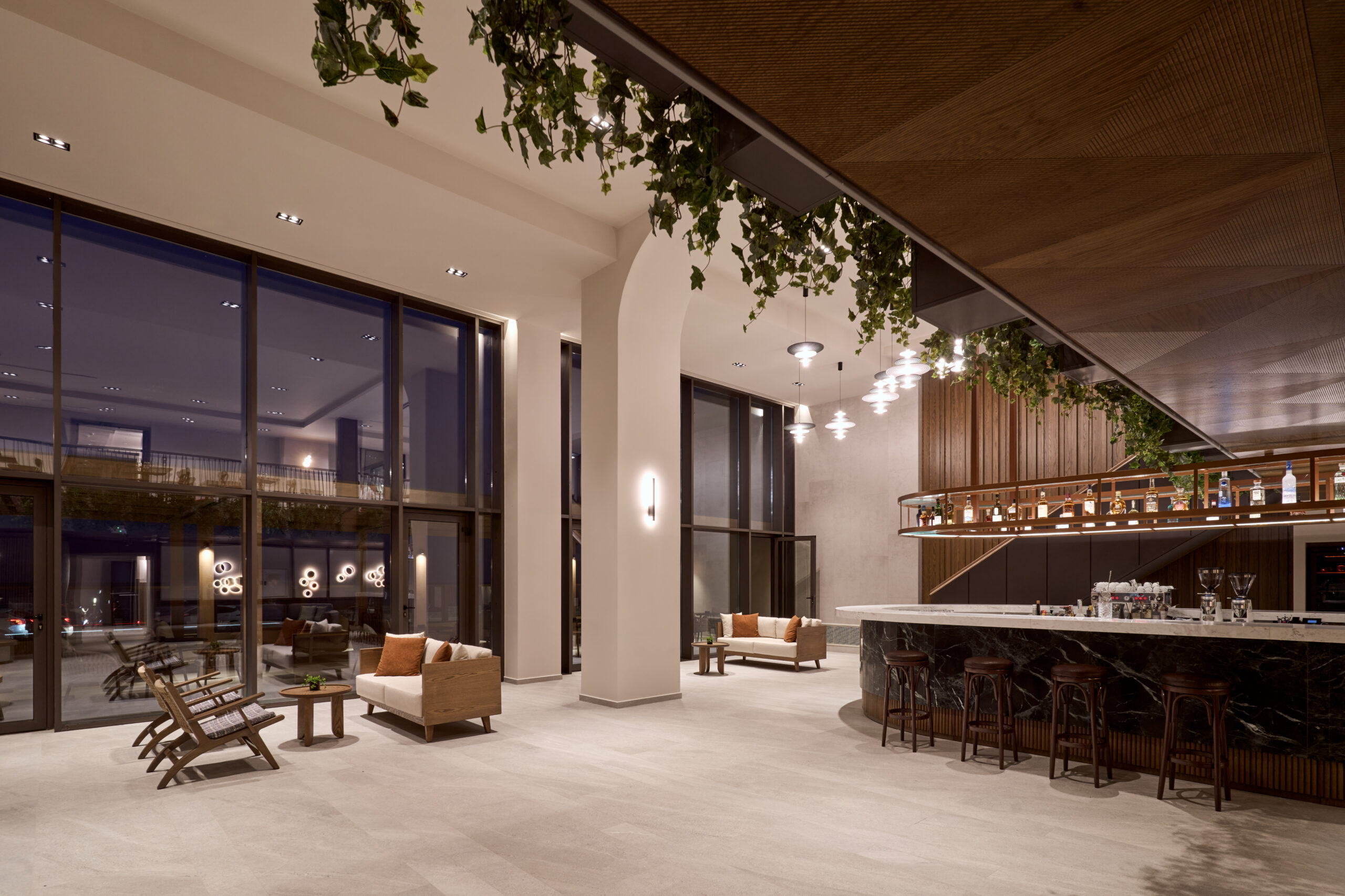 The hotel lobby is conceived as a striking double-height space, integrating a lounge, waiting area, reception, and bar. On the mezzanine level, the kitchen and restaurant facilities are strategically arranged.