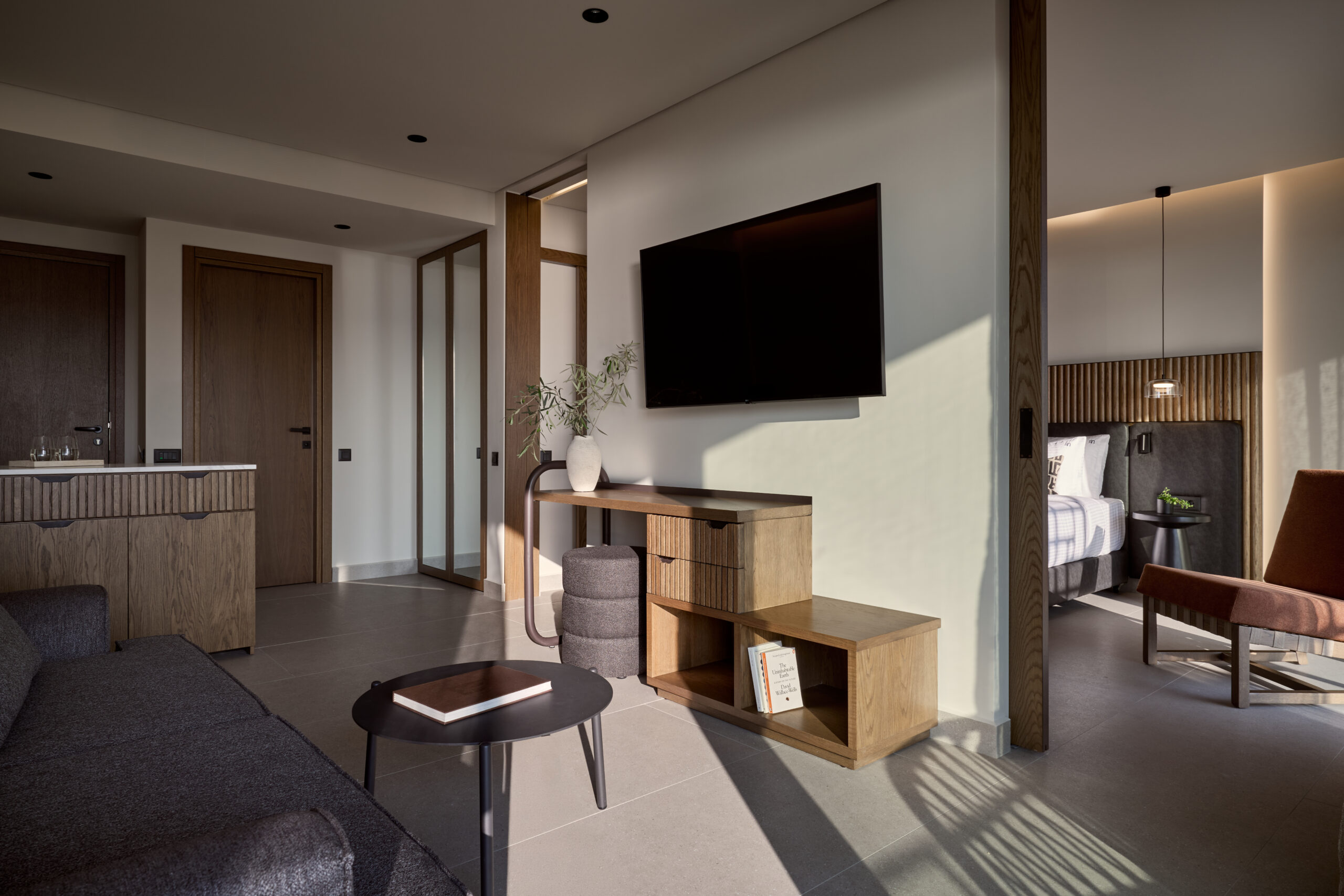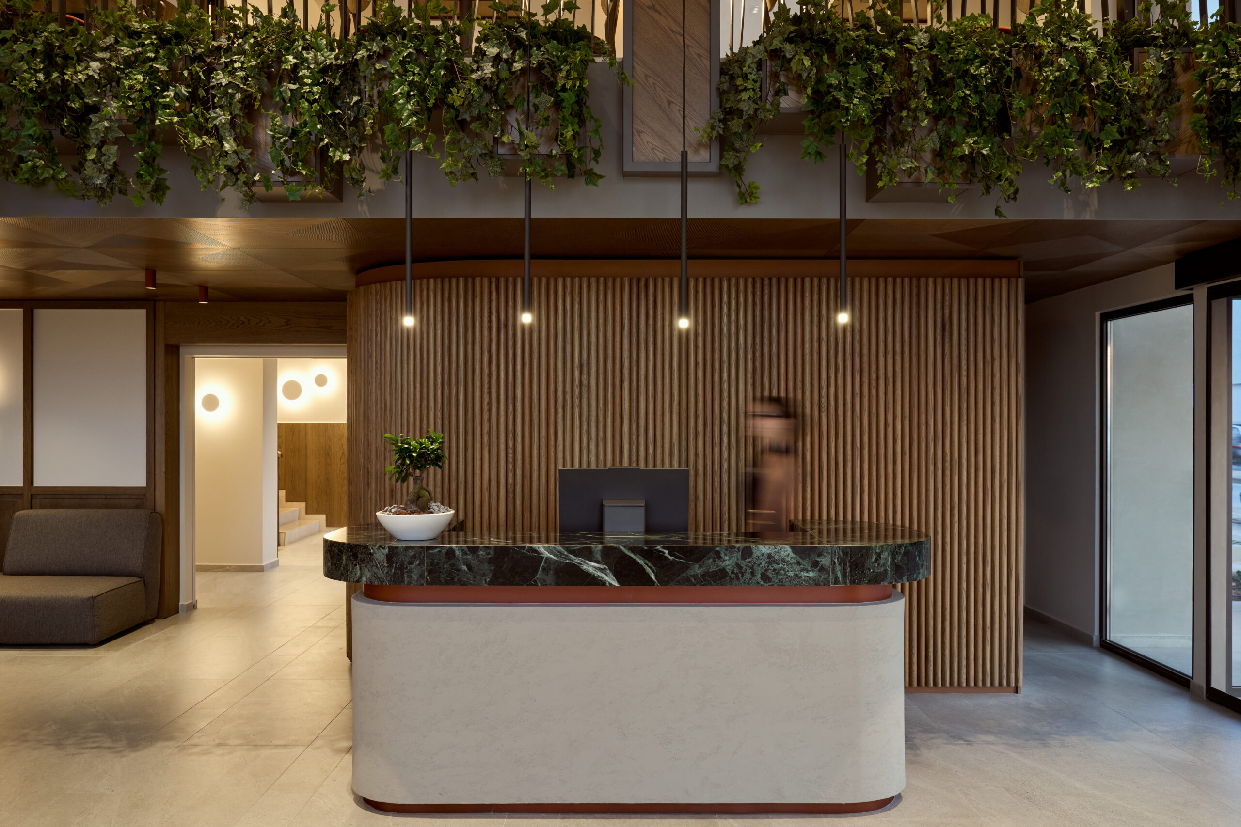 The reinforced concrete structure of the building pre-existed at the commencement of our design intervention for this city hotel in Heraklion, Crete. The project concerns a six-storey urban hotel comprising a total of 35 rooms. The floor plan is organized in a Π-shaped configuration, articulated by two primary volumes. The north-facing elevation opens towards the Cretan Sea, offering all guestrooms unobstructed sea views. The central section of the Π accommodates the main entrance and communal areas, while the smaller wing hosts additional rooms overlooking the side street.