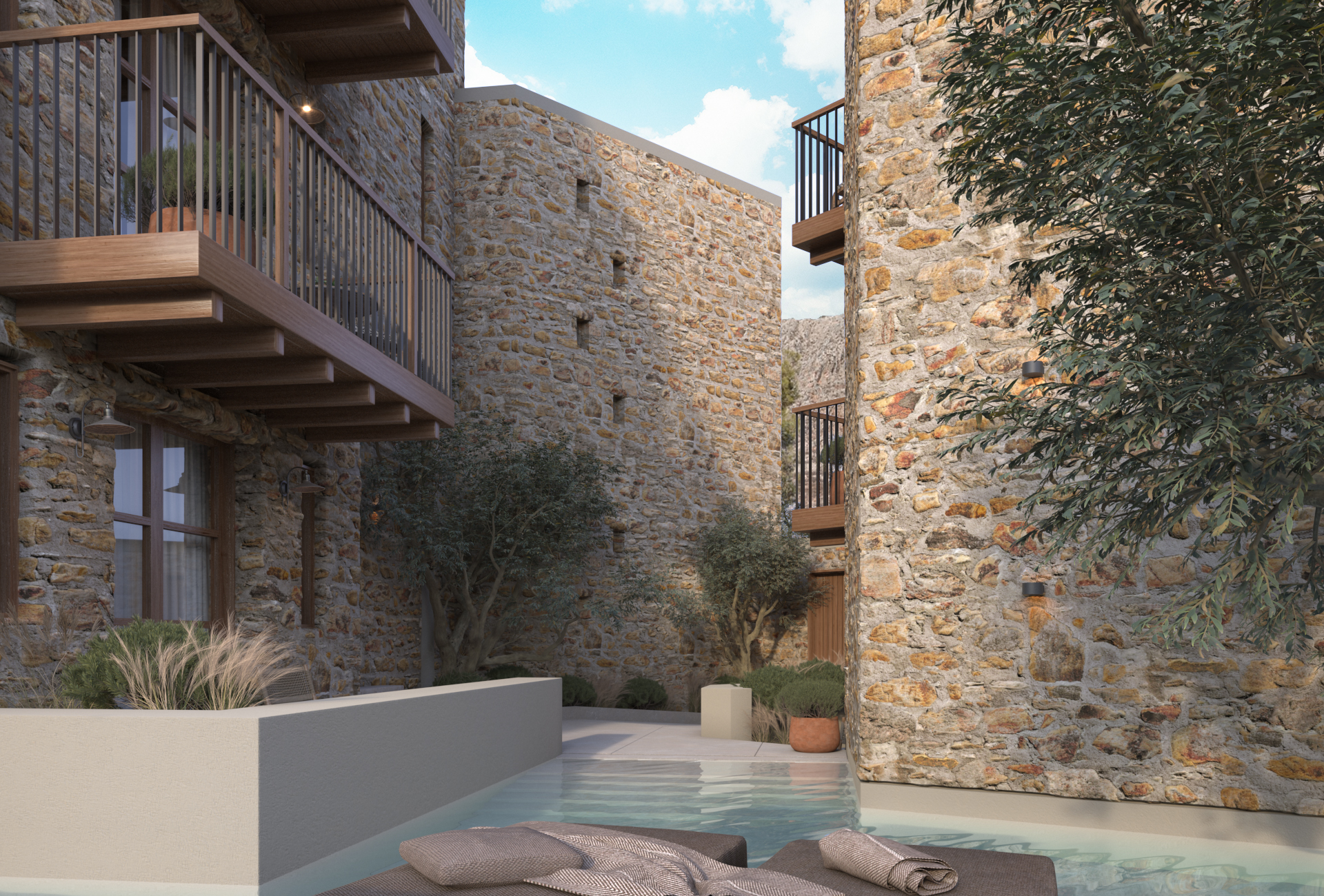 The architecture proposal seeks a balance between local identity and contemporary functionality. Stone dominates the façades, with small vertical bands and plaster lintels framing the openings and creating a contemporary dialogue with traditional materiality. The buildings feature tiled pitched roofs. The window frames, balconies, and railings are made of wood, referencing traditional Maniot houses.